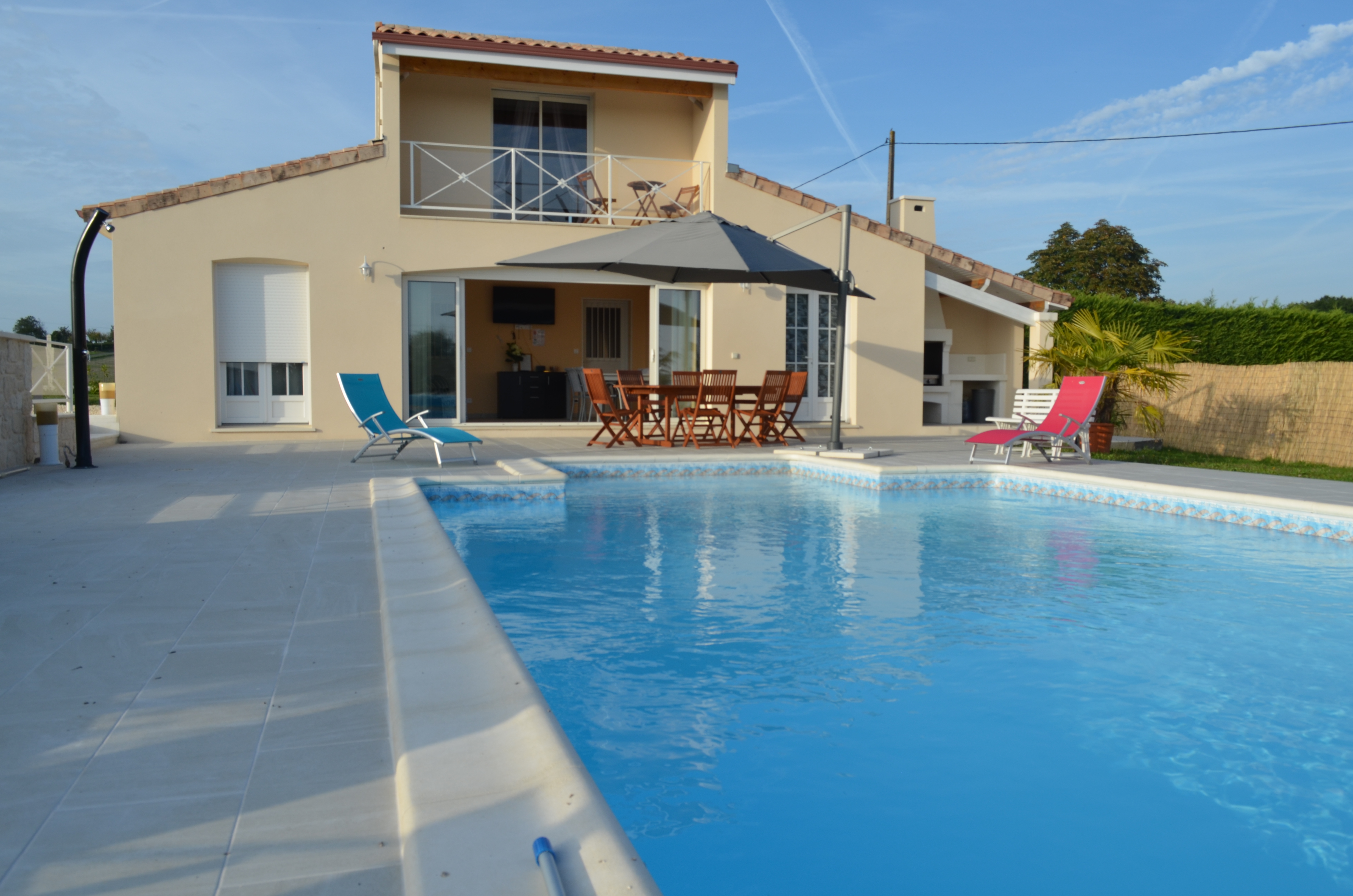 - d'un salon/salle à manger avec vue sur la piscine par une large baie vitrée